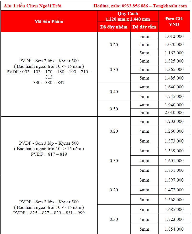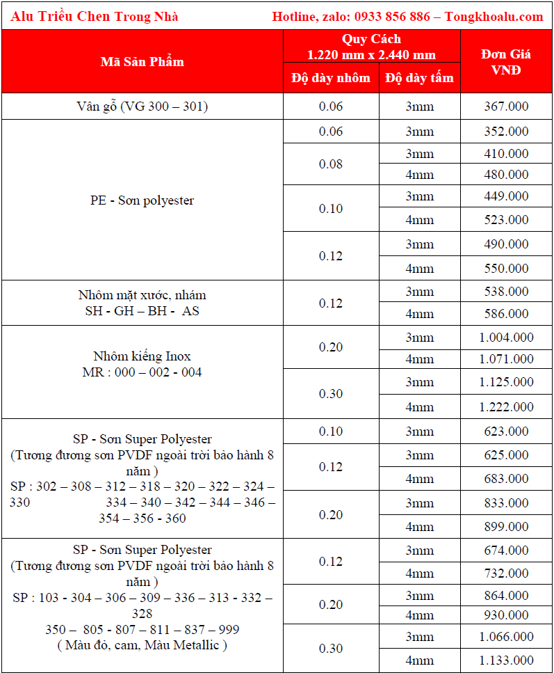 Alu Trieuchen có hai loại là alu trieuchen ngoài trời pvdf và alu trieuchen trong nhà pet, alu trieuchen là loại alu có mức giá tương đối rẻ phù hợp với mọi nhu cầu. Ứng dụng alu triều chen như làm bảng hiệu alu, ốp mặt dựng alu, ốp alu quầy kệ, showroom…